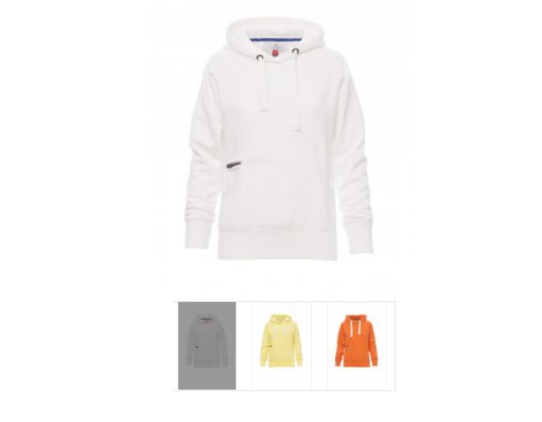 Sudadera con capucha ceñida para mujer con doble costura y cordón blanco con puntadas y aros metálicos de contraste, mangas ranglán, pespunte en cuello de pico, bolsillos canguro, pequeño bolsillo con cremallera, puños y dobladillo elásticos, costuras reforzadas.