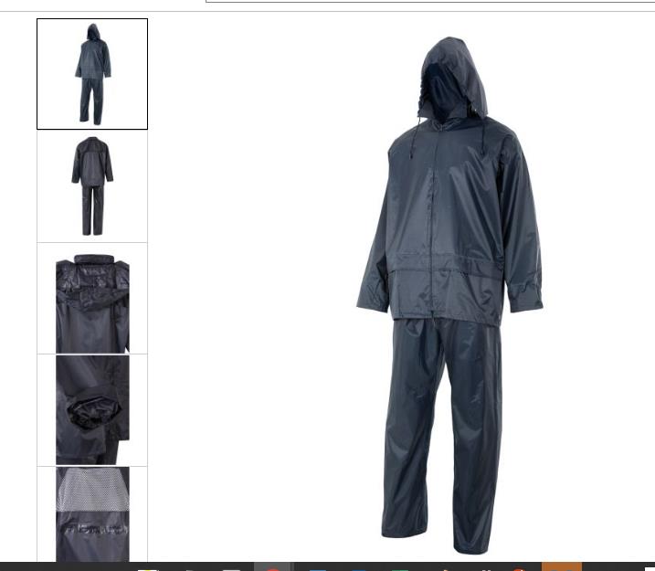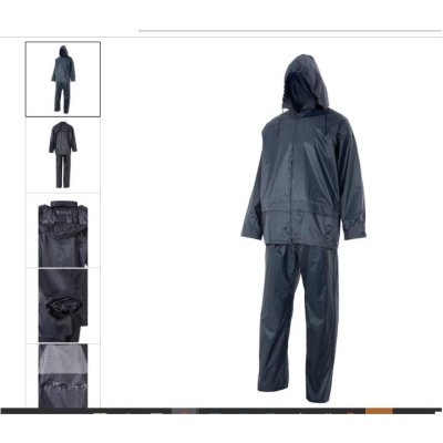 (CHAQUETA, PANTALON) (Colores 010 amarillo, 020 verde, 040 azul) Chaqueta: traje de agua con capucha, ventilación en el dorso y bajo las axilas. Cremallera de plástico cubierta con botones. Dos bolsillos con cierre botón. Pantalón: con elástico en la cintura. Composición: PU/PVC/poliéster. Tallas: S-M-L-XL-XXL-3XL verde, azul. M-L-XL-XXL amarillo. Colores: amarillo, verde, azul.
