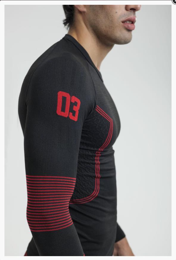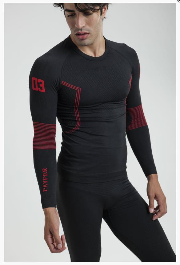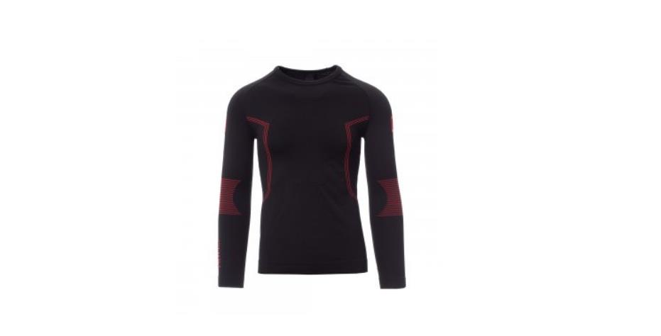 Camiseta térmica de hombre, de cuello redondo y manga larga raglán. Tejido suave y elástico, con tramas especiales en el delantero y en la espalda, motivos de hélice en relieve en los costados para garantizar una buena transpiración y una termorregulación constante. El cuello, el bajo y los bordes de las mangas son de punto canalé del mismo material para un mejor confort. Estructura tubular ergonómica y textura especial en los codos para garantizar una adaptación perfecta a la fisonomía del cuerpo.