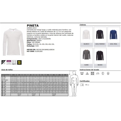 Camiseta de manga larga y cuello redondo para hombre, con banda elástica en cuello de elastano de 1,5 cm con pespunte superior en la parte delantera, cinta de refuerzo de contraste de hombro a hombro visible en la parte interior del cuello, costuras elásticas, costuras laterales