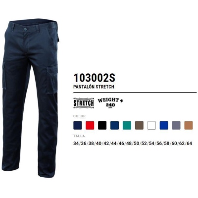 Pantalón stretch multibolsillos de 240gr/m2 con TIRadores y presillas.Refuerzo trasero de tejido. Diseñado con dobles costuras de sguridad y presillas para garantiza mayor durabilidad. Tiene 6 bolsillos, dos franceses muy cómodos y cuatro de planton-tapeta con velcro y tirador, destacando la gran capacidad de los bolsillos laterales para meter numerosas herramientas. Tallaje europeo con la cinturilla elástica de goma que lo hace unisex. COMPOSICIÓN: Stretch. 16% poliéster – 46% algodón – 38% EMET GRAMAJE: 240 gr/m2