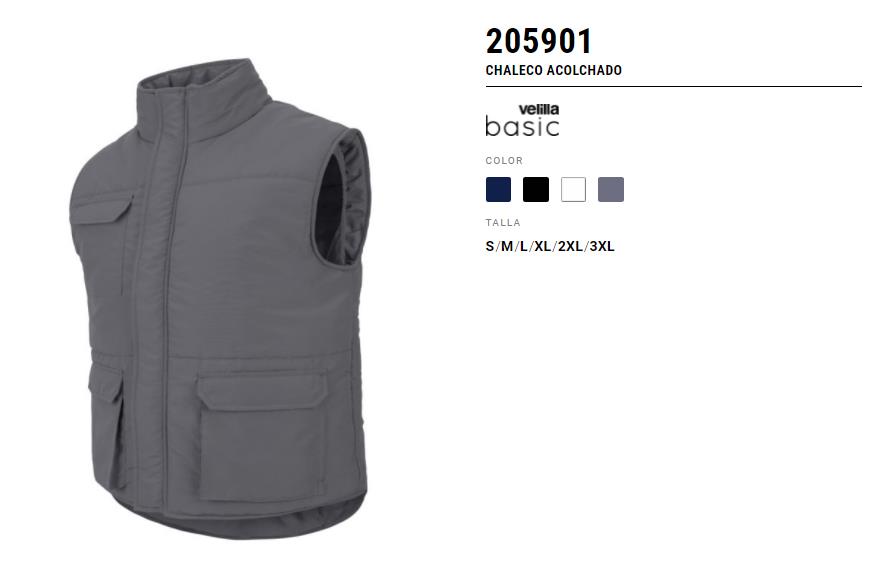 Chaleco multibolsillos acolchado con cierre central de cremallera oculta con tapeta y botones automáticos. Varios bolsillos externos con tapeta y velcro y goma elástica en el interior de los laterales de la cinturilla.