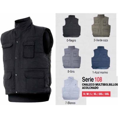 Chaleco multibolsillos acolchado con cierre central de cremallera oculta con tapeta y botones automáticos. Varios bolsillos externos con tapeta y velcro y goma elástica en el interior de los laterales de la cinturilla.