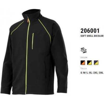 Chaqueta soft Shell bicolor con cirre central de cremallera estanca en color de contraste.Tapeta interna vuelta en la parte superior taàmdp ña cremallera. Color contraste en cremalleras, presillas y vivos de ña soñña deñamtera y trasera . Cintura ajustable con stopper. Puños ajustables con velcro. Pinzas en los codos. 5 Bolsillos, 2 interiores. Soft Shell menbrana tpu con forro polar. Exterior 94 %polieter, 6% elasteno, 320 gr. Forro 100% poliester