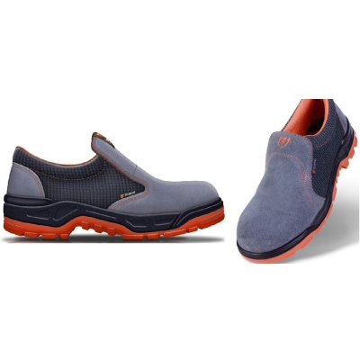 Zapato seguridad serraje afelpado sin cordones. Cuádruple cosido de seguridad con forro textil transpirable. Tejido FRESH exterior. Puntera “composite” y plantilla anti perforación textil (EN 12568). Suela poliuretano Bi Densidad en color naranja/negro (Con componentes anti-hidrolíticos (LLS – Long Lasting Sole), con un periodo de almacenamiento sin degradación de la suela de 6 años máximo, certificado por SAT