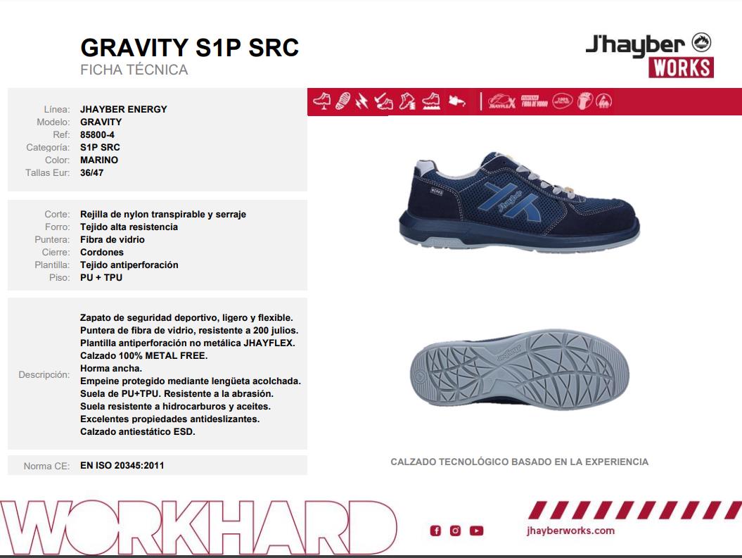 El modelo GRAVITY está fabricado con rejilla trenzada de nylon que lo hace más liviano, resistente y transpirable, y elementos de seguridad como puntera de fibra de vidrio y plantilla antiperforación. Este modelo se caracteriza por su ligereza, su estilo deportivo y comodidad, el nuevo estándar del calzado de seguridad.
