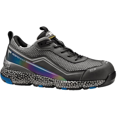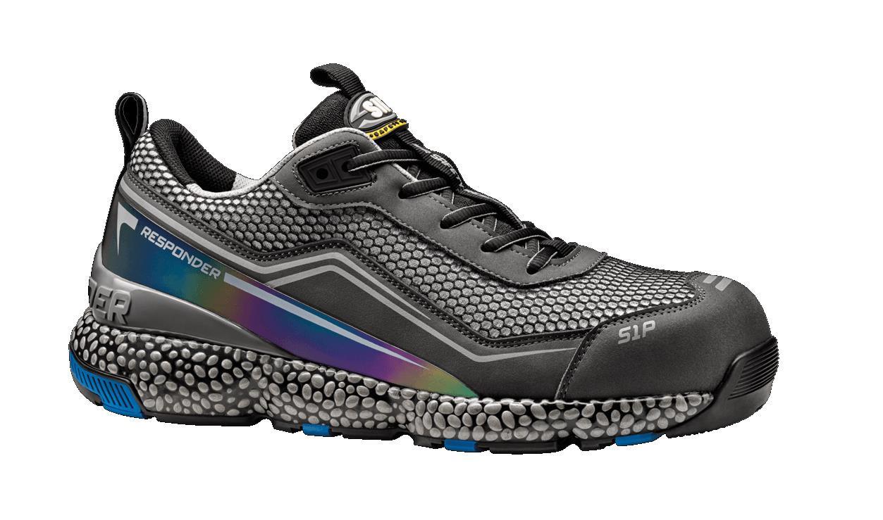 Calzado bajo de diseño ultradinámico con puntera de aluminio y lámina de composite con un espesor constante de 4 mm. Cuenta con un corte de Air-Mesh/microfibra con cierre de cordones e inserciones de reflex. La suela de E-TPU Responder/Caucho proporciona a los zapatos un excelente efecto de elasticidad y amortiguación: la entresuela de espuma de poliuretano de célula cerrada se extiende por toda la planta del pie garantizando la flexibilidad y la amortiguación reactiva integral. La suela externa de goma, gracias a las profundas ranuras longitudinales, acentúa la flexibilidad de la suela y garantiza un agarre superior en cualquier tipo de superficie. Grado SRC antideslizante.
