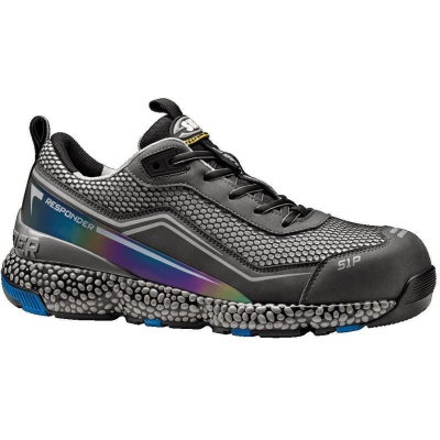 Calzado bajo de diseño ultradinámico con puntera de aluminio y lámina de composite con un espesor constante de 4 mm. Cuenta con un corte de Air-Mesh/microfibra con cierre de cordones e inserciones de reflex. La suela de E-TPU Responder/Caucho proporciona a los zapatos un excelente efecto de elasticidad y amortiguación: la entresuela de espuma de poliuretano de célula cerrada se extiende por toda la planta del pie garantizando la flexibilidad y la amortiguación reactiva integral. La suela externa de goma, gracias a las profundas ranuras longitudinales, acentúa la flexibilidad de la suela y garantiza un agarre superior en cualquier tipo de superficie. Grado SRC antideslizante.