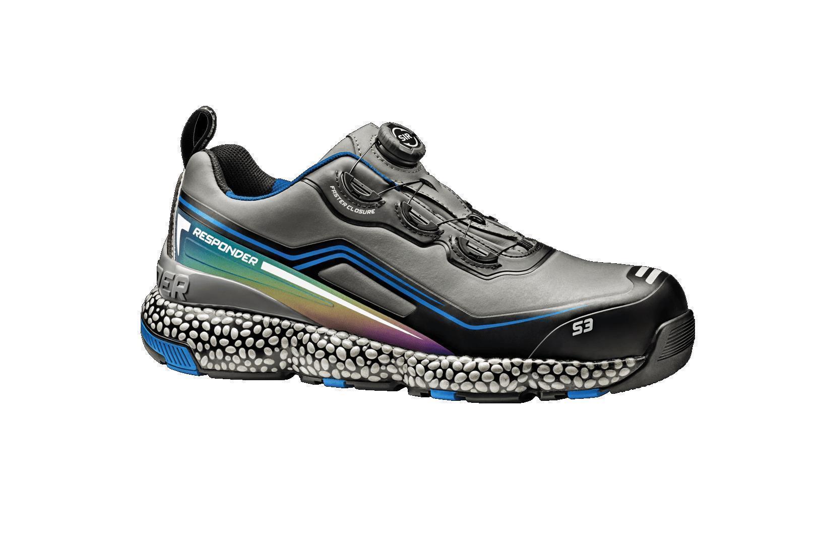 Calzado bajo de diseño ultradinámico con puntera de aluminio y lámina de composite de espesor constante de 4 mm. Cuenta con un corte de microfibra con sistema de lazada rápida «Faster» e inserciones de reflex. La suela de E-TPU Responder/Caucho proporciona a los zapatos un excelente efecto de elasticidad y amortiguación: la entresuela de espuma de poliuretano de célula cerrada se extiende portoda la planta del pie, garantizando la flexibilidad y la amortiguación reactiva integral. La suela externa de caucho, gracias a las profundas ranuras longitudinales, acentúa la flexibilidad de la suela y garantiza un agarre superior en cualquier tipo de superficie. Grado SRC antideslizante.
