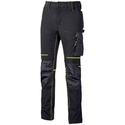 Pantalón en tejido U-4 (U-Power 4 vías stretch), muy cómodo y resistente, suave para la piel, repelente al agua, muy transpirable y secado muy rápido. Equipado con dos grandes bolsillos delanteros, cintura elástica con un innovador sistema de ajuste retráctil. Rejilla trasera acentuada para una mayor protección de la parte lumbar y cinta roja / reflectante en el cinturón tubular trasero. Bolsillo lateral para herramientas, bolsillo lateral multifuncional con porta tarjeta ocultable, dos bolsillos traseros, uno con solapa y otro con cierre de seguridad con velcro, dos bolsillos con entrada porta rodilleras, todo en un resistente Polyoxford 600D. Dos bolsillos cerrados con cremallera corespondientes al bolsillo lateral y al bolsillo delantero derecho. Costuras triples. Cierre central con cremallera YKK y botón antiarañazos, Slim Fit.